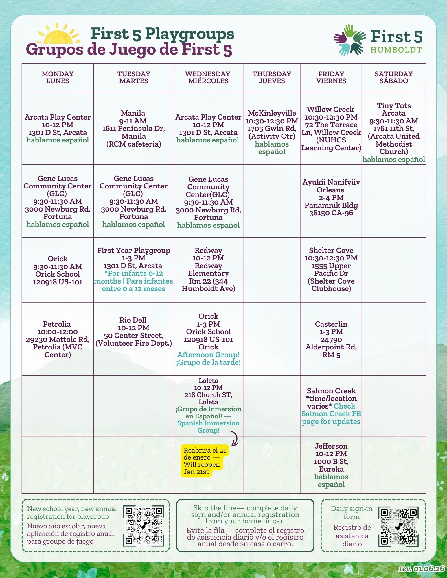 La ubicación y el horario variarán durante el verano. Por favor, llame a MVRC para confirmar los detalles.