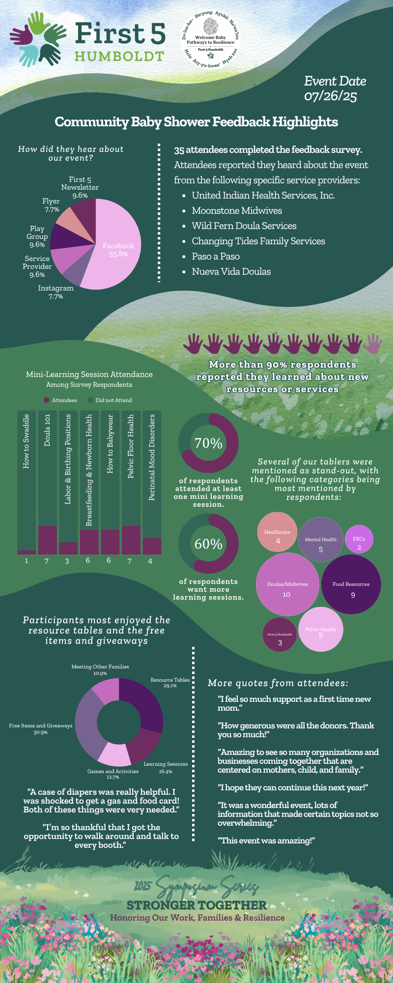 Welcome Baby programs were a majority contributor to the Community Baby Shower that First 5 Humboldt hosted in July 2025. Following this event, thirty-five attendees completed our feedback survey and the data highlights from this survey can be downloaded below.